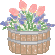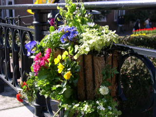 運河にかかる橋の欄干にかけられたハンギングバスケット。 |