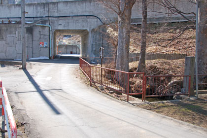↑の拡大写真は、上の写真の切り出しですが、カメラの限界の600万画素の等倍まで拡大してあります。 こうしないと、作品中に描き込まれている鉄骨のリベットが確認出来ないからです。 恐ろしく細かく描き込まれた背景描写ですね。 さて、そして、ここからしばらく歩いたその先にあったのが…、