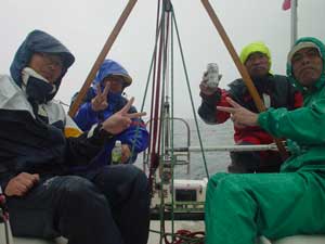 雨の中でのレースでしたが、参加40艇のトップでフィニッシュ! 福岡のカッパおやじさん達、たいへんご苦労様でした。大健闘です!! |