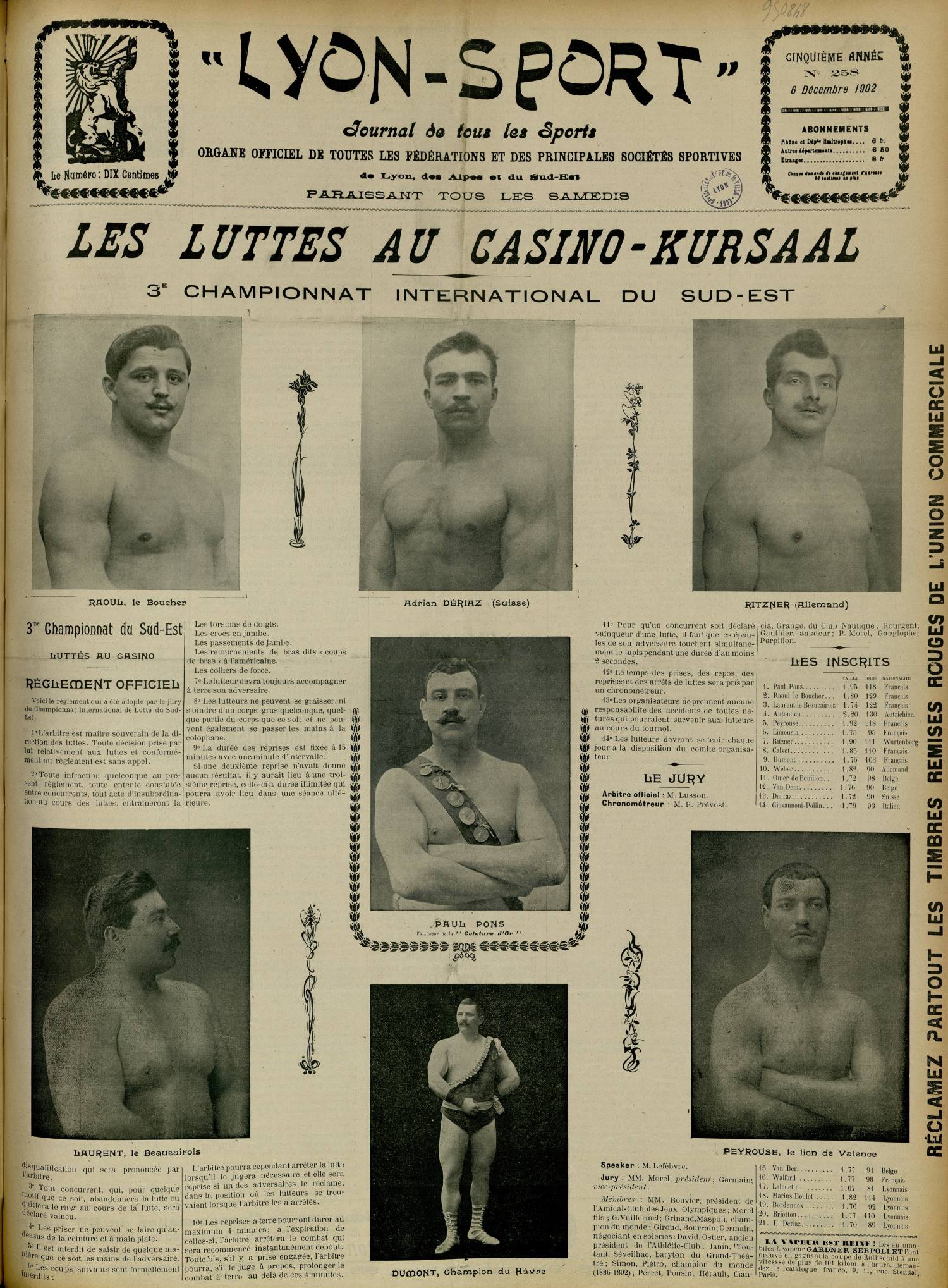 La Bibliotheque municipale de Lyon リヨン市立図書館 Press lyonnaise du ]\°siecle 十九世紀のリヨンの新聞 http://collections.bm-lyon.fr/presseXIX/showObject?id=PER003&date=00000604 Lyon-sport 06 decembre 1902 http://collections.bm-lyon.fr/PER00319034?page=1 http://collections.bm-lyon.fr/PER00319034/PAGE0_View http://collections.bm-lyon.fr/PER00319034/PAGE0_PDF 3me Championnat du Sud-Est LUTTES AU CASINO REGLEMENT OFFICIEL 第3回南東部選手権 カジノでのレスリング 公式規定 Voici le reglement qui a ete adopte par le jury du Championnat International de Lutte du Sud-Est. これは南東部のレスリング国際選手権の審査委員達によって採択された規定である。 1° L’arbitre est maitre souverain de la direction des luttes. Toute decision prise par lui relativement aux luttes et conformement au reglement est sans appel. 第一、行司はレスリングの管理に関する至上の支配者である。レスリングに関してかつ規定に従って彼により下されたあらゆる判定は決定的で控訴はない。 2° Toute infraction quelconque au present reglement, toute entente constatee entre concurrents, tout acte d’insubordination au cours des luttes, entraineront la disqualification qui sera prononcee par l’arbitre. 第ニ、この規定に対するあらゆる任意の違反、競技者間で確認されたあらゆる了解、レスリングの最中のあらゆる不服従の行為は、行司によって宣告されよう失格をもたらそう。 3° Tout concurrent, qui, pour quelque motif que ce soit, abandonnera la lutte ou quittera le ring au cours de la lutte, sera declare vaincu. 第三、あらゆる競技者は、皆、それに如何なる理由があろうとも、レスリングを諦めるかまたはレスリングの最中にリングを離れるかしよう者は、負けを宣せられよう。 4° Les prises ne peuvent se faire qu’audessus de la ceinture et a main plate. 第四、掴みは腰より上にかつ平手でなされる他は許されない。 5° Il est interdit de saisir de quelque maniere que ce soit les mains de l’adversaire. 第五、それが如何なる仕方であろうとも敵の両手を握ることは禁じられる。 6° Les coups suivants sont formellement interdits : Les torsions de doigts. Les crocs en jambe. Les passements de jambe. Les retournements de bras dits ≪ coups de bras ≫ a l’americaine. Les colliers de force. 第六、次の技は明確に禁じられる。 指の捻り。 脚絡み。 脚の突き。 腕の逆又の名を「腕固め」米国風。 力のネックレス。 7° Le lutteur devra toujours accompagner a terre son adversaire. 第七、レスラーは常に地面上には彼の敵と同行しなければならない。 8° Les lutteurs ne peuvent se graisser, ni s’oindre d’un corps gras quelconque, quelque partie du corps que ce soit et ne peuvent egalement se passer les mains a la colophane. 第八、レスラー達は身にグリースを塗ることも、それが如何なる物体の一部であろうとも、任意の脂っぽい物体を身に塗布することも許されずかつ手を松脂に着けることもまた許されない。 9° La duree des reprises est fixee a 15 minutes avec une minute d’intervalle. Si une deuxieme reprise n’avait donne aucun resultat, il y aurait lieu a une troisieme reprise, celle-ci a duree illimitee qui pourra avoir lieu dans une seance ulterieure. L’arbitre pourra cependant arreter la lutte lorsqu’il le jugera necessaire et elle sera reprise si un des adversaires le reclame, dans la position ou les lutteurs se trouvaient lorsque l’arbitre les a arretes. 第九、各ラウンドの継続時間は一分の合間を伴う15分と定められる。 もし第二ラウンドが如何なる結果ももたらしていなかったならば、第三ラウンドの場があろう、こちらは時間無制限にてその後の大会の中で行われることがあり得よう。 行司はしかしながら彼がそれを必要と判断した時にレスリングを止めることができそしてもし選手の一人がそれを要求するならば、行司が彼等を止めた時にレスラー達がある所の態勢に於いて、それは再開となろう。 10° Les reprises a terre pourront durer au maximum 4 minutes; a l’expiration de celles-ci, l’arbitre arretera le combat qui sera recommence instantanement debout. Toutefois, s’il y a prise engagee, l’arbitre pourra, s’il le juge a propos, prolonger le combat a terre au dela de ces 4 minutes. 第十、地面上の継続は最大4分保ち得る。こちらの期限満了時に、行司は闘いを止めそれは直ちに立って再開されよう。ただし、もし掛かっている技がある場合、行司は、もし彼がそれを適当と判断すれば、地面上での闘いをその4分以上に延長し得る。 11° Pour qu’un concurrent soit declare vainqueur d’une lutte, il faut que les epaules de son adversaire touchent simultanement le tapis pendant une duree d’au moins 2 secondes. 第十一、競技者があるレスリングの勝者と宣せられるためには、彼の敵の両肩が同時に敷物に持続して少なくとも2秒間着かなければならない。 12° Le temps des prises, des repos, des reprises et des arrets de luttes sera pris par un chronometreur. 第十二、レスリングの闘い、休憩、再開と停止の時間は計時係によって計測されよう。 13° Les organisateurs ne prennent aucune responsabilite des accidents de toutes natures qui pourraient survenir aux lutteurs au cours du tournoi. 第十三、試合の最中にレスラー達に起こり得る所のあらゆる自然の事故について主催組織は如何なる責任も取らない 14° Les lutteurs devront se tenir chaque jour a la disposition du comite organisateur. 第十