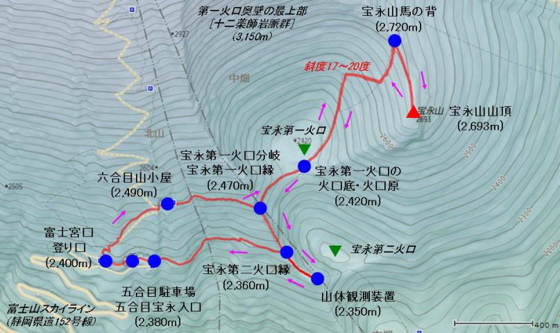 ●2025年8月27日(水) 静岡県富士山マイカー規制・富士山スカイラインマイカー規制の中、静岡県各3登山口における登山規制の実施に伴う入山料(4,000円)の事前納付を行い 富士山スカイライン・富士宮口五合目(標高2,400m)から「富士宮ルート」(富士宮口登山道、平均勾配:32.3%≒平均斜度:17.9度)で、富士宮口八合目(標高3,250m、池田館)まで登山して来ました。今回は、体調を考慮して登頂はせず、富士宮口八合目(標高3,250m)から御殿場口七合七勺(標高3,210m)に続く「トラバースルート」(連絡路)を経由して、「御殿場ルート」(御殿場口下山道、大砂走り)と「宝永山遊歩道」(プリンスルートの一部、宝永山馬の背~宝永山第一火口底の斜度:17~20度)[約7.56kmの周回コース]で、下山しました。(走行距離=約178km)