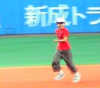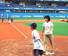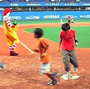 | ANAでペアの指定券があたったので、てつりょうで観に行きました。くじ運の強いりょうは当日1等のグッズも当てましたが、マフラータオルがメインと大したものではありませんでした。試合後、小学生対象のベースランニングに参加しました。2塁を回ったあたりはへらへらしてたのに、走り終わった時は「疲れた!」と言ってました。ちっちゃい頃は何ぼでも走っとったのに。 |