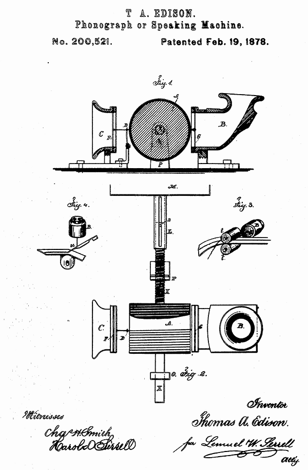 エジソンのPhonographのUS特許: 主に錫箔(tin foil)に記録する。Fig.1は垂直断面図、Fig.2は上から見た平面図で10 threads per inchのピッチで円筒管Aの端から端まで記録する。同様に支柱P(pillar)にはネジタップ(雌ネジ)が切ってあり回転軸Xと組み合わせて送り装置となる。Bは吹込管でCは後のSound-Boxの原型でそれぞれ振動膜Diaphragmを備える。Cの振動膜FはBの振動膜Gより軽く感度が高い方がよいが必須の条件ではないと述べています。foilを被せた盤の両面を螺旋状にインデント録音するアイデアも併記されています。紙テープを使うMorse Telegraph Registerへの言及もあります。記録方法はindentationに限定しないとしています。Fig.3は紙テープ等の上に糸を置き圧力ローラーで挟み糸をBのdiaphragmと針穴を通して接続することで横記録(diaphragm vibration→糸の左右の動き→圧力ローラー→紙に痕跡を残す→糸を取り除いてIndent痕を再生)。Fig.4は紙の上にペンとインクで縦記録し(インクの厚みの変化が残るので)それをsecond diaphragmで再生する。Fig.3と4はエジソンの無茶ぶりを示すものでしょう:特許文書にはオマケや伏線が書き込まれ、万一他所で同様のものが実現したとき、こっちの方が最初と訴えることができる常套句のようなものです。エジソンは数多くの特許訴訟をおこしていますが、後世の我々にとってエジソンの偉大さは特許ではなく実際に音を記録再生できる機械を創出したことにあります。特許提出(1877年12月15日)に先立ちエジソンの機械工John Kruesiが12月第一週に図面通り試作し一発で成功したそうです。後年1906年談話によると、メリーさんの羊"Mary Had a Little Lamb、etc"と大声でエジソンが吹き込みそれを再生してエジソン自身びっくりした。そしてレコードの歴史が始まりました。