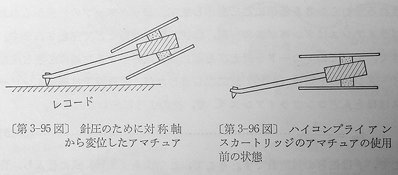 In connection with above, I find that superficial cantilever angle is not always equal to VTA. In fact, VTA is also concerned with the effective sensing arrangement of generating system as shown in my following drawing for Decca cartridges claiming on "positive scanning". Its vertical sensing point (i.e., armature of magnetic piece) and its sensing direction (i.e., vertical coil wound on the extension of pole piece) are not known from appearance - its true VTA is different from tension thread angle and cantilever angle (some old documents indicated VTA 0 degree for early ffss maybe from structure or appearance while Yamamoto measured 12 degrees). An explanation on drawing. When the armature is extended to H position, then the pole piece and coil angle must be inclined or when the end of armature is located at L position, then the pole piece and coil angle must be arranged vertical. Otherwise, effective VTA is not equal to cantilever angle. Once I imagined these pole piece angles were corresponding to VTA, but both angles can be valid and having same effect when the armature extension is designed correspondingly. I find two drawings for Decca: vertical pole piece (old patent paper) and inclined pole piece (MK4) but could not know the effective location of armature. The real magnetic circuit cannot be known from diagrammatic drawings or appearance because the magnetic flux flows not straightforward (usually arc) and the armature has considerable volume or length (not a single point as shown diagrammatically). Same can be said about legendary Neumann DST (Elektrodynamischer Stereo Tonabnehmer) having much obscure magnetic circuit. Its stereophonic generating system cannot be understood without arc magnetic flux in repellent magnetic fields produced by two magnets.