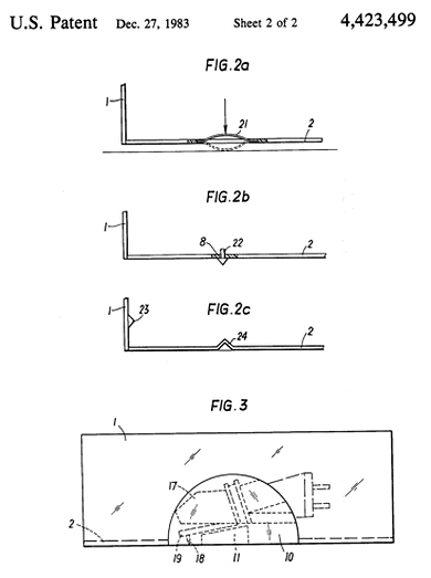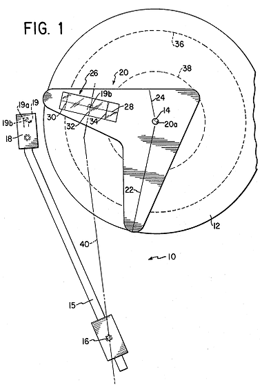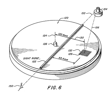 Phonograph cartridge alignment template: US patent 4,368,527 (1983) invented by Goldstein. This plate combines angle alignment on mirror and overhang alignment around the centre spindle with spiral curve line. This invention refers to an article entitled "Cartridge Arm and Turntable vs. The Groove: Who's Winning?", in the July/August/September 1977 issue of the "Audio Critic" about optimum cartridge alignment. Goldstein explains as under (in italic):