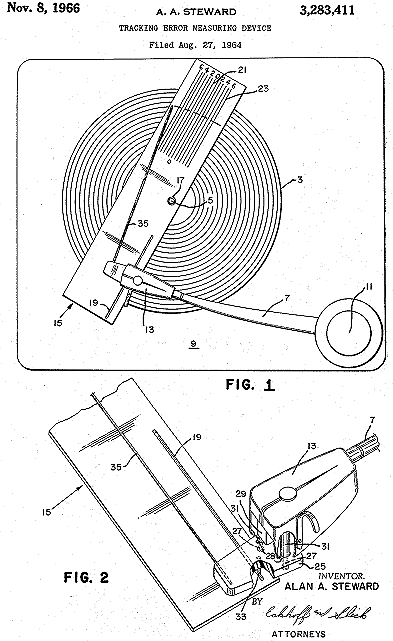 Tonearm alignment gauge: US patent 4,490,816 (1984) invented by Kehl and assigned to Shure. This device adopts two null points method though specific null point location is not clarified. This device is not universal since the receptacle for cartridge body without stylus holder has to be designed in accordance with respective cartridge body.