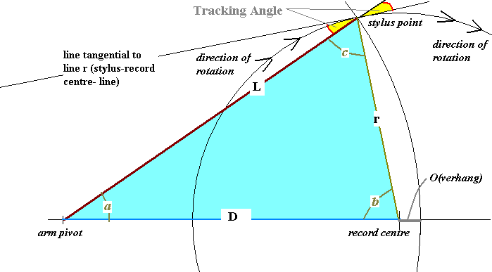 Distortion due to lateral tracking angle error is relative to groove radius r, signal velocity v and tracking error angle A and groove velocity V: 2nd harmonic distortion=v*TAN(A)/V [v:signal velocity, A:error in radian, V=pi*r*RPM/30]. A book by JVC (1979) indicated as under (d=overhang, lateral tracking angle δ on ordinate). The alpha in lower drawing shows relative distortion rate weighted by groove radius. When maximum angle error at outmost groove is 3degrees, then the value alpha is calculated as 3degrees/150mm=maximum 0.02degrees per mm. When three weighted peak distortions at inmost/mid/outmost groove are of same rate, then the distortion over whole groove radii can be kept "almost" at the lowest as Loefgren and Baerwald had proposed in SP era. But actually it is still questionable whether it is possible or not to make both the angle of Line A to B and the angle of Line C to B at "exact" same rate. Loefgren/Baerwald and others sought solution to make these values "almost" same. I am still wondering whether there can be some optimum or "mystic numbers" about specific arm length and specific groove range making "exact" same value of weighted distortion on three points.
