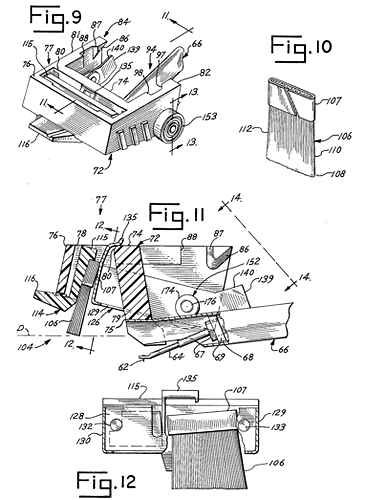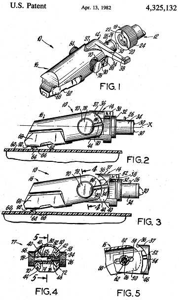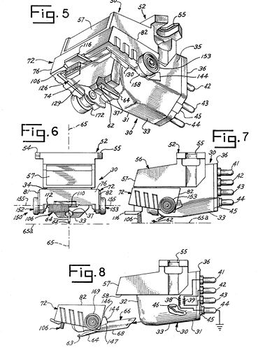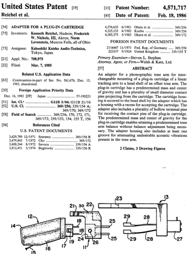 ADCのProtrac(シェル一体型カートリッジ)の特許図でVTAとOverhangが別個に調整できるというものでした。日本側のシェル関連特許が多く引用されています(シェルとカートリッジ間に楔を入れてVTAを調整する日立のアイデアやテストレコードでセパレーションを測定しそれをアームに付いたモータでシェルの左右傾きを自動調整するパイオニアのアイデアなど奇抜なものが含まれています)。