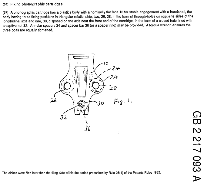 英国Rega社は以下の1989年の特許申請図のようにカートリッジの3点止めを提案しました。特許そのものは1998年の段階で”PATENT CEASED THROUGH NON-PAYMENT OF RENEWAL FEE”とあります(特許公開までは漕ぎ付けたがお金になる・他社にパテント使用料を払ってもらえる内容ではないので特許権取得を止めたのでしょう)。針の振動点の真上にもう一つネジ穴を設ける工夫でした。針交換出来ないMMタイプの高級カートリッジ・シリーズBias/Elys/Exacでこれを実現しました(MCタイプのAphetaも同系列と思われる)。Rega社のアームのシェルの先端にもそれに見合った穴があります。Linn社はRegaと逆の三角形の3点留めをGB 2199718(1988)で提案しましたが製品化はされていないようです(Linnの特許の状態もRega社のケースと同じ)。ここまでやるなら、MMカートリッジの場合にはアームとカートリッジを一体型にして針だけ交換する方が合理的ですね(SMEタイプ交換シェル>シェル一体型アーム>シェルを省いたカートリッジ固定アームーこの逆の順番にマニア度が上がると一部のマニア間では信じられています)。SMEタイプ交換シェルが付いた一体型カートリッジも古くからあり、日本では80年前後一時的に流行しました(一社がやると他社まで同じようなことをする無節操)。