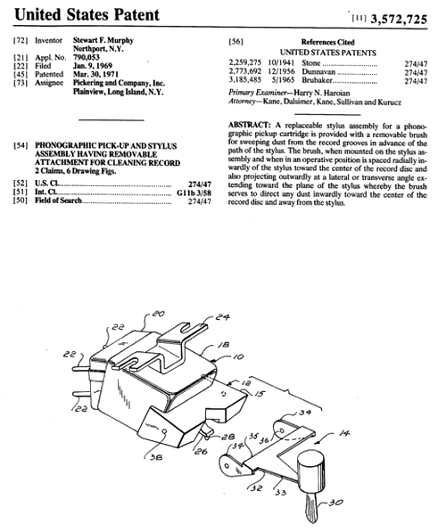 Pickering社も着脱可能なブラシ機構を持つカートリッジを発表しました。ダンプというよりこれからトレースする溝の塵を露払いのように掃くアッタチメントでした。マニュアルにはこれを取り付けた時は約1g針圧を増やすように指示がありました(インサイドフォースの調整もダスタマチック・ブラシを付けているときはそれに準じる)。ところでFig.2の変なところに気づかれましたか?ゴミは箒の前ではなく後ろ側に溜まるはずです。ゴミを針のトレース上から排除する目的ですが、結果は溜まったゴミが途中から盤上に散布されます。