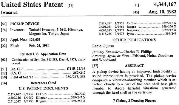 シェルにおいでTable 1を見るとおりアルミやマグネシウムに比べてセラミック系は硬いが伝達速度が早すぎて反射が起こるので、振動反射を遮断するためには図の9のように一部にvibration-absorbing memberを貼り付けるのが良いと言う論旨です。その制振材は”composed mainly of polydiorganosiloxane and inorganic fine powders, said polydiorganosiloxane having an average molecular weight of not less than 15,000; and the hardness of said vibration-absorbing member (9) is within the range of from about 8 to about 30”とのことです。この素材は繊維の軟化材や水溶性撥水剤などに使われているものらしい。岩沢氏はカートリッジのハウジング・フレームにセラミックを採用する工夫で別のUS特許も得ています。そこにも材料特性表があり、従来のプラスチックレジンとの比較をしています。MCタイプのFIG.1の10-13(ベース)と24(側板)にセラミックを採用するものでした。図の25と26はヨークとケースをダンプする粘弾性剤(visco-elastic materials)で、常温では固体のシリコングリスを想定しています。MMタイプのFIG.2では111-113にセラミックを使うアイデアのようです。余談ですが、京セラの塩見氏もセラミックシェルの日本特許公開S54-156605をしましたが未請求で終わりました(京セラが80年代初め発売したアームレス・ベルトドライブ・ターンテーブルシステムには各所にセラミックを使っていました)。塩見氏は本文でSAECの酸化アルミ焼結体シェルの特開S53-19002にも言及し「比較的硬い音質になるなど鋭い音感を持ったオーディオマニアを必ずしも満足させ得るものとは言えなかった」と評し、窒化物の焼結体をベースに表面に静電的影響を遮断する層を追加してシールドとすると同時に(表面がセラミック本体よりも柔らかいことから)吸音・ダンプ効果を併せ持つという趣旨でしたが、関連製品は不明です。1980前後アナログの末期、特に日本ではターンテーブルシートやシェルなどに目新しい素材を使ったものが多く現れ、まさに素材の乱痴気騒ぎを見る思いがしましたが、どれも能書きほどのことはなかったというのが私の個人的な感想です。スパークプラグで有名なNGKまでセラミックを使ったシェルを発明していました(日本特許1330608)。釣具のOlympicもボロンやカーボン繊維のプレプレグを使ったアームパイプで特許申請していました(特開S58-111101)。トリオと京セラが組んでセラミックパイプアーム(特開S55-22221)の開発を試みました。
