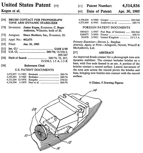 Monks/Hadcockなどはアーム支点近くをオイルダンプすることで低域共振のQを抑える工夫をしましたが、このパテントはアームの先端位置でダンプするアイデアです。しかし偏芯したりワープが激しいレコードには低域共振などよりももっと惨い影響(針飛び)が生じそうです。