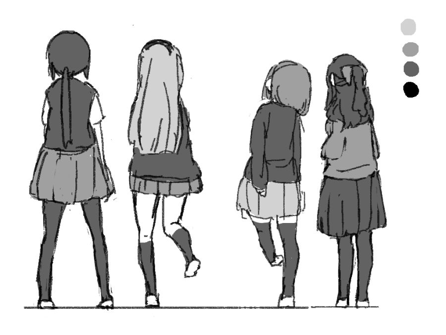 上の女子高生4人組も並んだときに見分けがつくように、髪型・目・体型・服装・スカートの長さ・靴下・部活・家族構成など、要素をある程度バラけさせています。