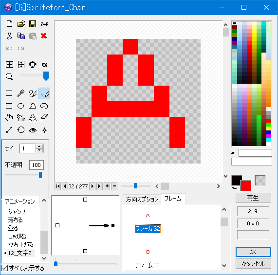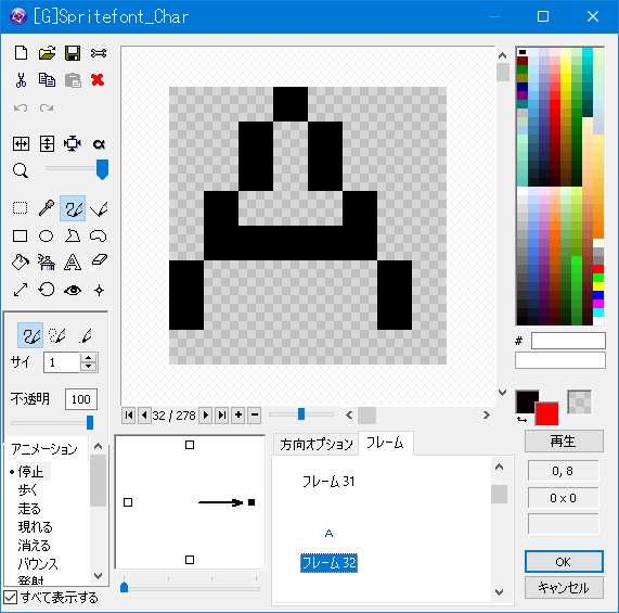 『[G]Spritefont_Char』のアニメーションエディタを開き、アニメーションの各フレームに使用する文字を設定します。