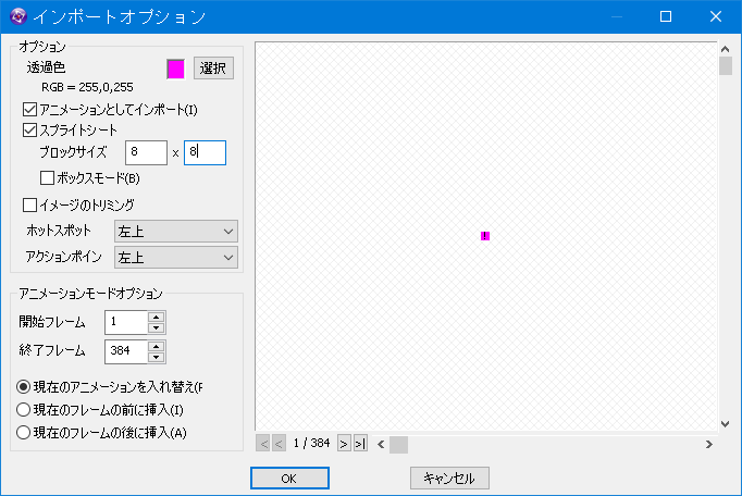 文字画像をセットする際は、予め文字画像を並べた1枚の画像を用意しておき、インポートオプションにて『アニメーションとしてインポート』『スプライトシート』にチェックを入れ、サイズを文字1文字のサイズに設定することで一度に取り込むことができます。