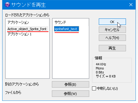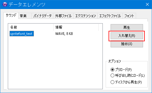 サウンドを変更する場合は、『spritefont text』を選択して『入れ替え』をクリックします。