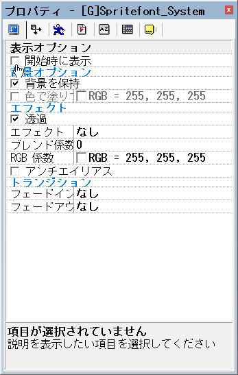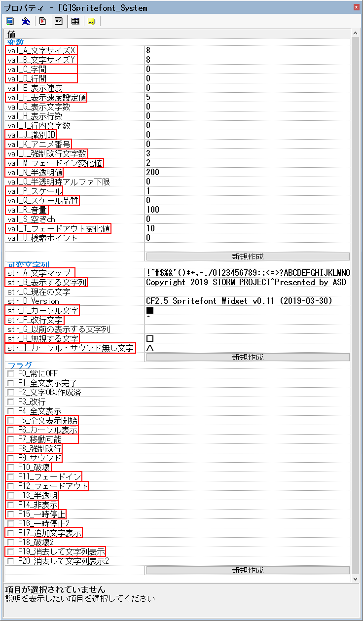 『[G]Spritefont_System』のプロパティを開き、変数・『値』タブの変数・可変文字列・フラグにて、文字情報・表示方法を設定します。