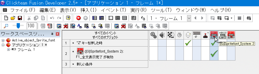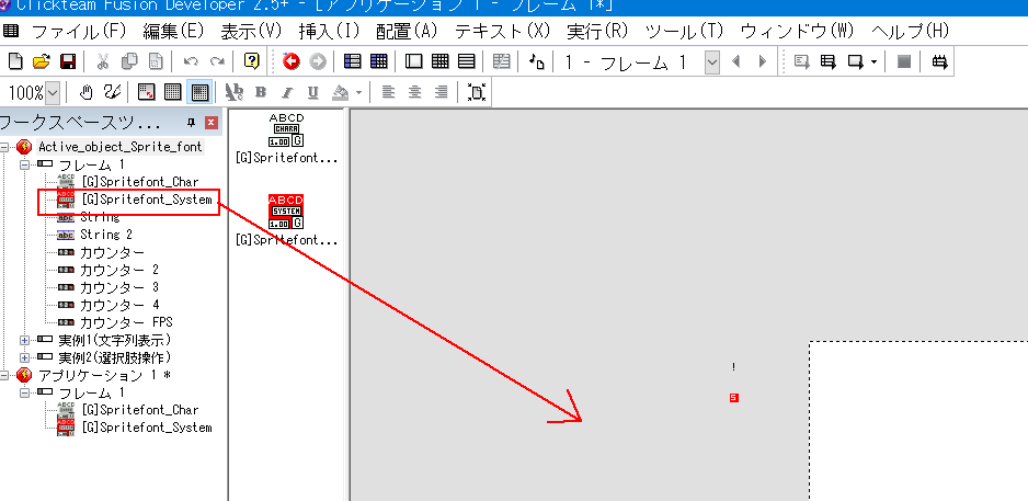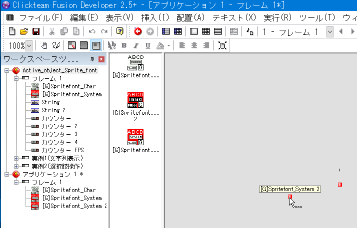 『active_object_spritefont.mfa』を開き、フレーム内の以下のオブジェクトを導入したいあなたのアプリのフレームへコピーします。