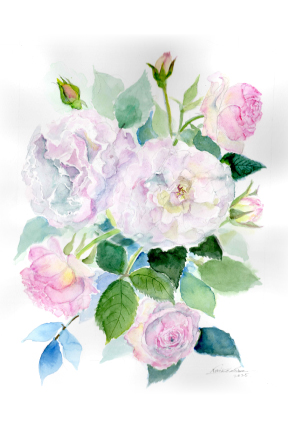 ふくよかな柔らかな大輪のバラ、やさしいその花びらは水彩画にぴったりの質感、みごとなバラでした。繊細に水の流れに頼って描きました。