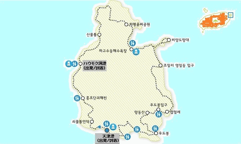 천진항(天津港)~천진항(天津港) 천진항(天津港) → 쇠물통언덕(セムルトンの丘) → 서천진동(西天津洞) → 홍조단괴해빈해수욕장(紅藻団塊海浜海水浴場)→ 하우목동항(ハウモク洞港) → 오봉리주흥동사거리(五逢里周興洞四つ角) → 답다니탑(タプタニ塔)→ 하고수동해수욕장(ハゴス洞海水浴場) → 비양도입구(飛揚島入口)→ 조일리영일동(助日里ヨンイル洞) → 검멀래해수욕장(コムモルレ海水浴場) → 만동산(マンドン山) → 꽃양귀비군락지(ポピー群落地)→ 우도봉정상(牛島峰頂上) → 돌칸이(トルカニ) → 천진항(天津港) ★出発点へのアクセスは、市外バスターミナルで、성산행(城山行[東回り一周道路])に乗り、선산포(城山浦)で下車。ここで、천진항(天津港)行きの連絡船に乗れば15分ほどで、천진항(天津港)に到着する。 |