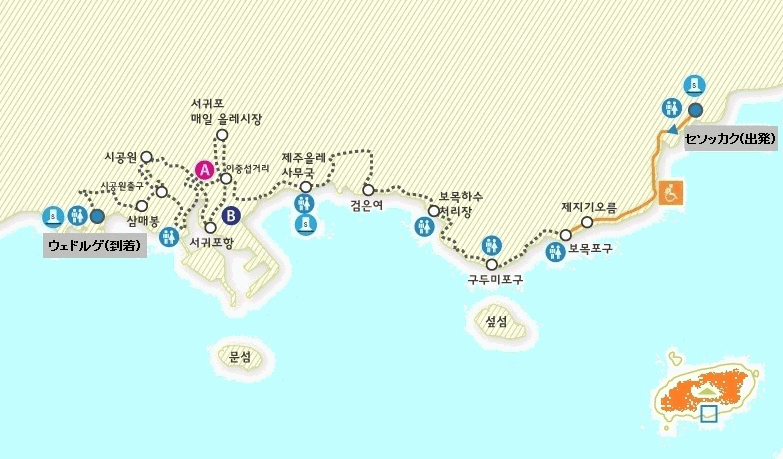 쇠소깍(セソッカク)~외돌개(ウェドルゲ) 쇠소깍(セソッカク) → 제지기오름(정상チェジギオルム)(2.6km) → 구두미포구(クドゥミ浦)(4.2km) → 검은여(コムンヨ)(6.8km) → ソジョンバン瀑布 /サザエの城(8.17km) → イ・ジュンソプ美術館 → 天地淵瀑布散策路(11km) → 외돌개(ウェドルゲ) ★出発点へのアクセスは、済州国際空港から 사귀포(西帰浦)行のリムジンバスに乗り、終点KALホテルで下車。ここで、タクシーを利用して쇠소깍(セソッカク)まで行く。 |