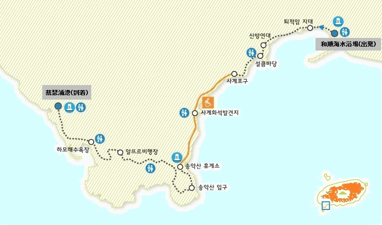 화순금모래해변(和順海水浴場)~모슬포항(慕瑟浦港) 화순금모래해변(和順海水浴場)→ 산방연대(山房煙臺)(2.4km) → 사계포구(沙係浦)(3.6km)→ 사계화석발견지(沙係化石発見地)(5.7km) → 송악산(松岳山)(8.4km)→ 섯알오름 추모비(ソダルオルム犠牲者追慕碑)(10.3km) → 알뜨르비행장(アルトゥル飛行場)(11.7km) → 하모해수욕장(下摹海水浴場)(13.1km)→ 모슬포항/하모체육공원(慕瑟浦港/下摹体育公園) ★出発点へのアクセスは、市外バスターミナルから、済州~西帰浦「西周り一周道路」に乗って、화순리(和順里)で下車。ここから海辺の方向に約10分ほど歩く。 |