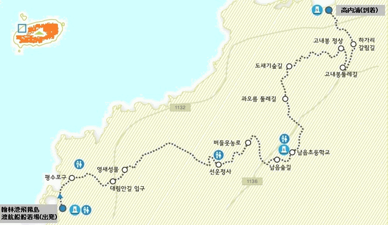 한림항 비앙도 항선 선착장(翰林港飛揚島渡航船船着場)~고내포구(高内浦) 한림항 비앙도 항선 선착장(翰林港飛揚島渡航船船着場) → 평수포구(ピョンス浦)(0.7km) → 성로동 농산물집하장(ソンロ洞農産物集荷場) (4.7km) → 혜린교회(ヘリン教会)(8.9km) → 납읍초등학교금산공원입구(納邑小学校金山公園入口)(10.5km) → 백일홍길 입구(百日紅の道入口)(12.1km) → 고내봉 입구(高内峰入口)(14.9km) → 하가리갈림길(下加里分岐点) (17.6km) → 고내포구(高内浦) (19km) ★出発点へのアクセスは、市外バスターミナルから、済州~西帰浦「西周り一周道路」に乗って、한림(翰林)で下車。 |