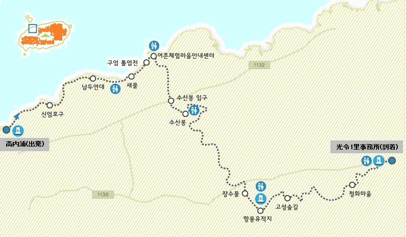 고내포구(高内浦)~광령1리사무소(光令1里事務所) 고내포구(高内浦)→ 남두연대(南頭煙台)(2.8km) → 구엄포구(旧厳浦)(4.8km) → 수산봉돌레길(水山峰登山)(6.4km) → 수산밭길(水山畑道)(9.6km) → 항파두리항몽유적지(缸坡頭里抗蒙遺跡地)(12.6km) → 고성숲길(古城森の道)(13km) → 청화마을(チョンファマウル)(16.1km) → 광령1리사무소(光令1里事務所)(17.8km) ★出発点へのアクセスは、市外バスターミナルから、済州~西帰浦「西周り一周道路」に乗って、고내(高内)で下車。海岸に向って5分ほど歩くと고내포구(高内浦)に出る。 |