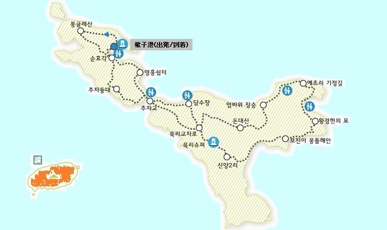 추자항(楸子港)~추자항(楸子港) 추자항(楸子港) → 추자등대(楸子灯台)(3.3km) → 묵리교차로(5.8km) → 신양항(新陽港)(7.7km) → 황경헌의묘(9.3km) → 엄바위장승(11.6km) → 돈대산(墩臺山)(12.8km) → 추자교(楸子橋)(15.4km) → 추자항(楸子港)(17.7km) ★済州空港でタクシーに乗り、제주항여객선터미널(済州港旅客船ターミナル)に行く。ここで추자도(楸子島)行の旅客船に乗船し、상추자항(上楸子港)で下船する。 ★済州島オルレの全コース中、最難関のコースではあるが、しかし眺望は最高のコースでもある。。周到な準備のもとに、挑戦してほしい。 |