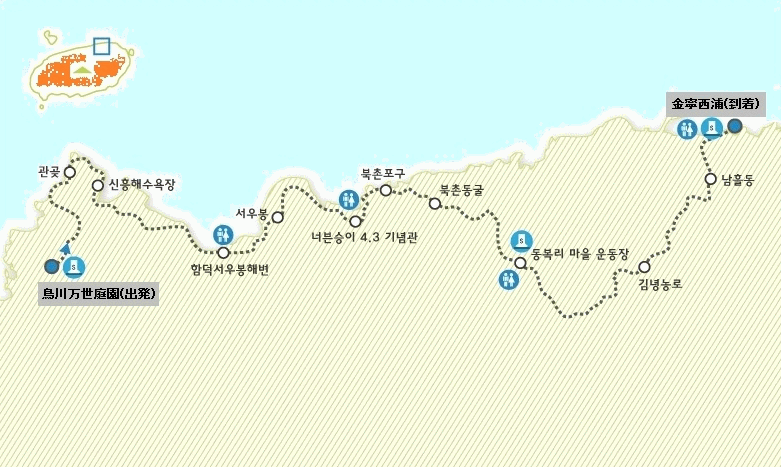 조천만세동산(鳥川万世庭園)~김녕서포구(金寧西浦) 조천만세동산(鳥川万世庭園) → 신흥해수욕장(3.1km) → 함덕서우봉해변(5.9km) → 너븐숭이 4.3 기념관 (8.9km) → 북촌 등명대(북촌포구)( 9.8km)→ 북촌동굴(10.8km) → 동복리 마을운동장( 12.9km) →김녕농로(金寧農道)( 15.8km)→ 김녕서포구(金寧西浦)(18.8km) ★出発点へのアクセスは、市外バスターミナルから、済州~西帰浦「東周り一周道路[성산(城山)経由]」に乗って、조천만세동산(鳥川万世庭園)で下車。 |