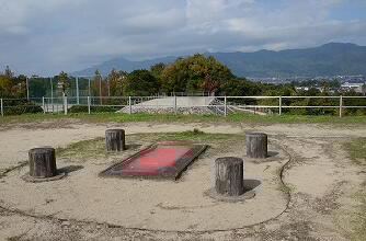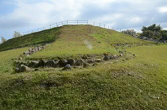 三号墓墳頂から出雲大社方面を望む 張り石が復元された二号墓をバックに