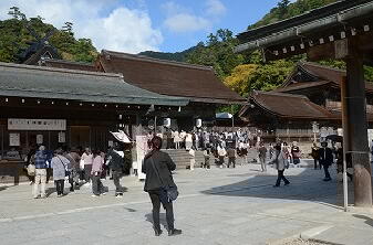出雲蕎麦を食べたあとは出雲大社に。見学前に『ご縁横丁』に寄ってワイフに勾玉のプレゼントを購入、神在月にだけしか造らないという羊羹も購入しました。
