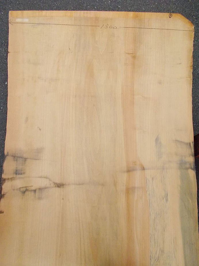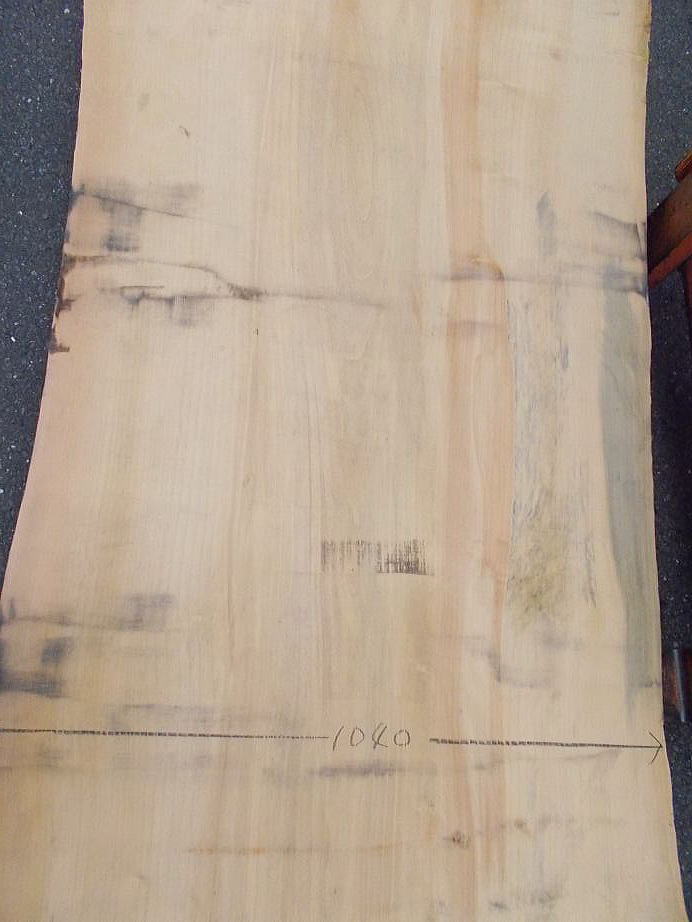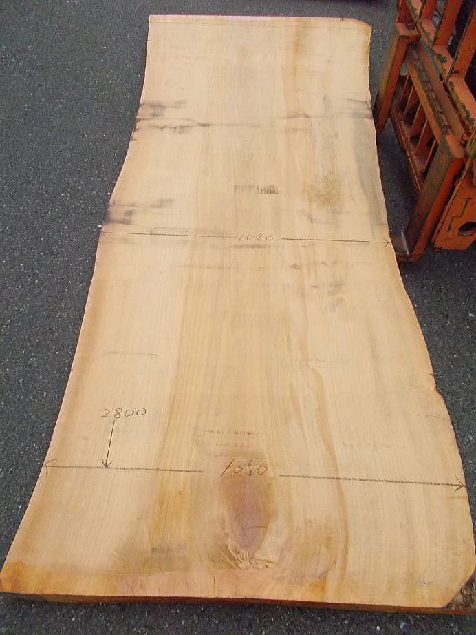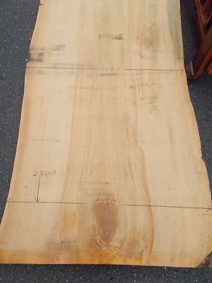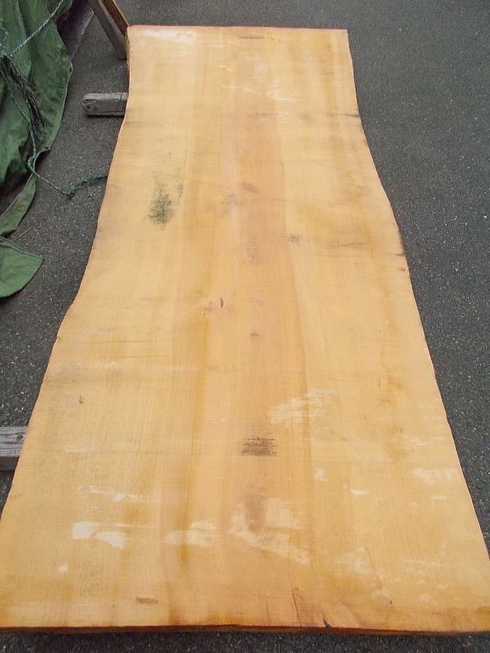 |  おもて面 (手前に干割れのある節があり、奥から節まで長さ2800mmです。)  裏面 (芯割れはありませんが、手前中央右に長さ510mm程の薄い割れがあります。) |    おもて面拡大 (手前に干割れのある節があり、奥から節まで長さ2800mmです。) | ||
