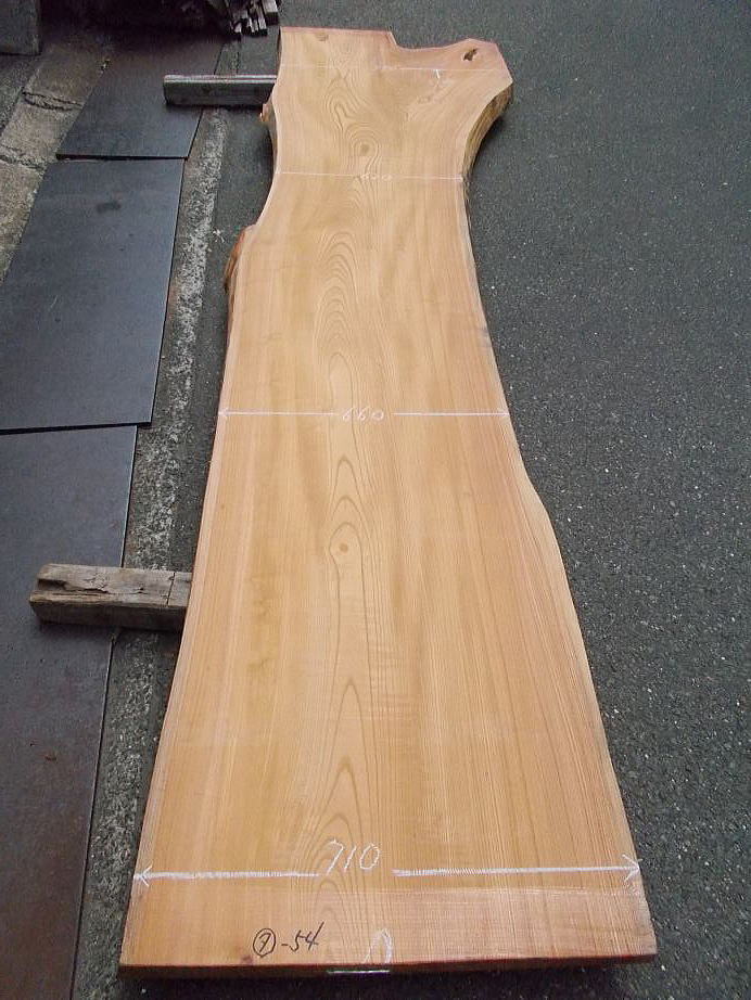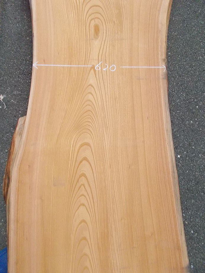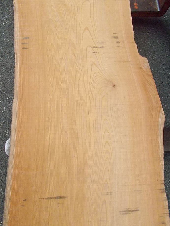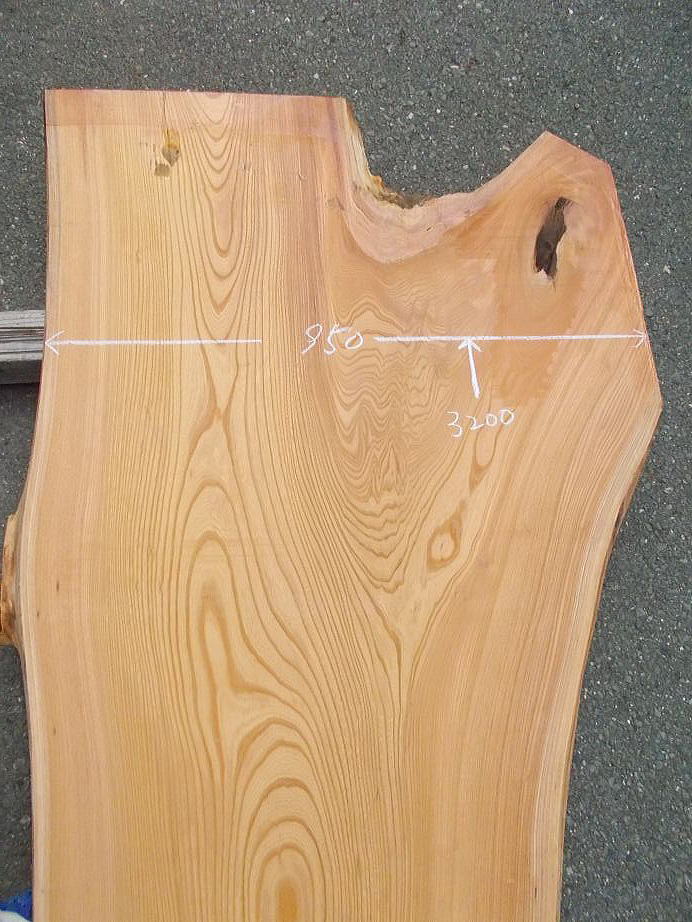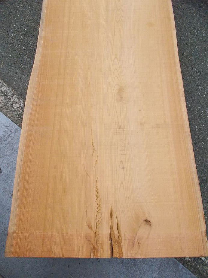 |  おもて面 (2〜3mm程の反りがあります。上下のハナ割れを外して長さ3200mm程です) (板の右側に細かいセンコウ虫穴が有ります。)    おもて面拡大 (2〜3mm程の反りがあります。上下のハナ割れを外して長さ3200mm程です) (板の右側に細かいセンコウ虫穴が有ります。) |  裏面 (奥のハナ割れ240mm、手前のハナ割れ500mmです。)    裏面拡大 (奥のハナ割れ240mm、手前のハナ割れ500mmです。) | ||