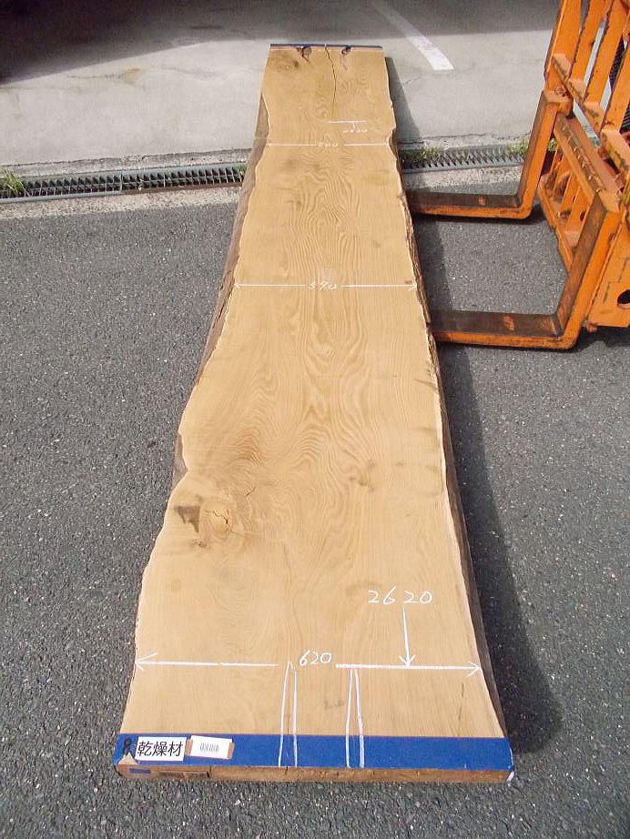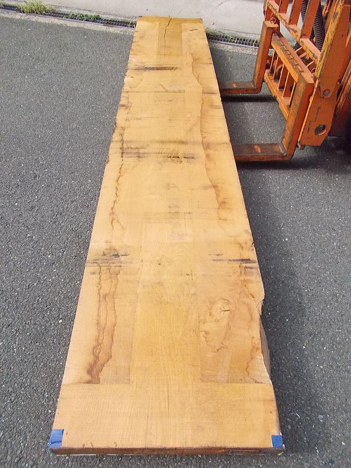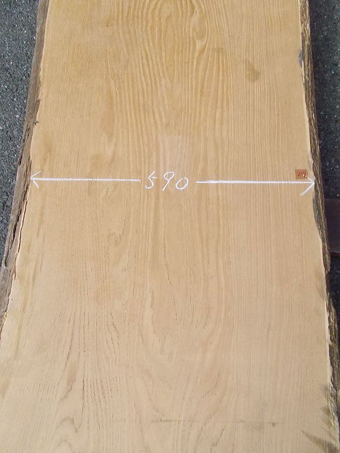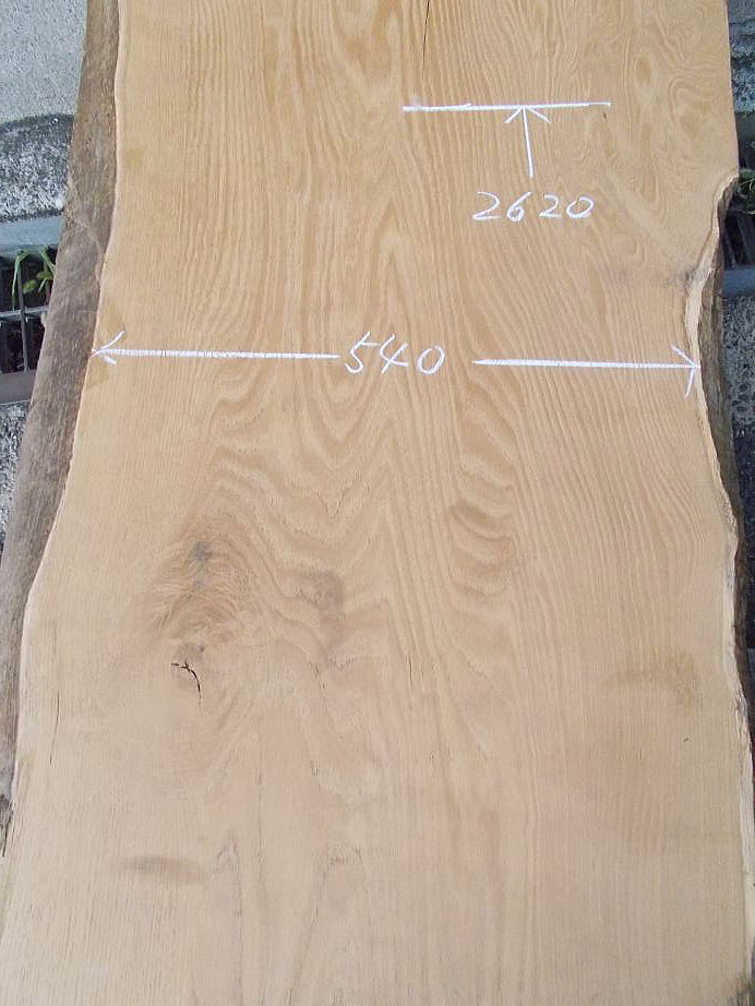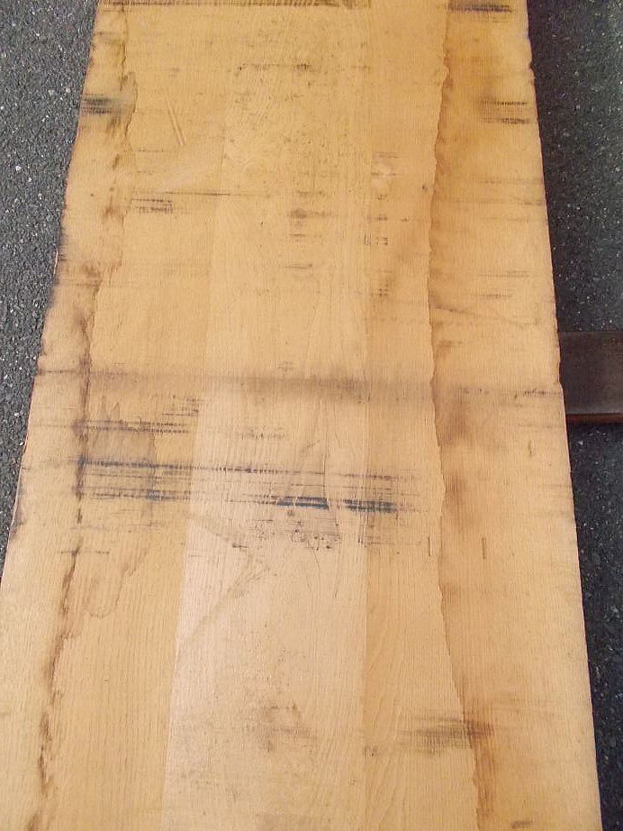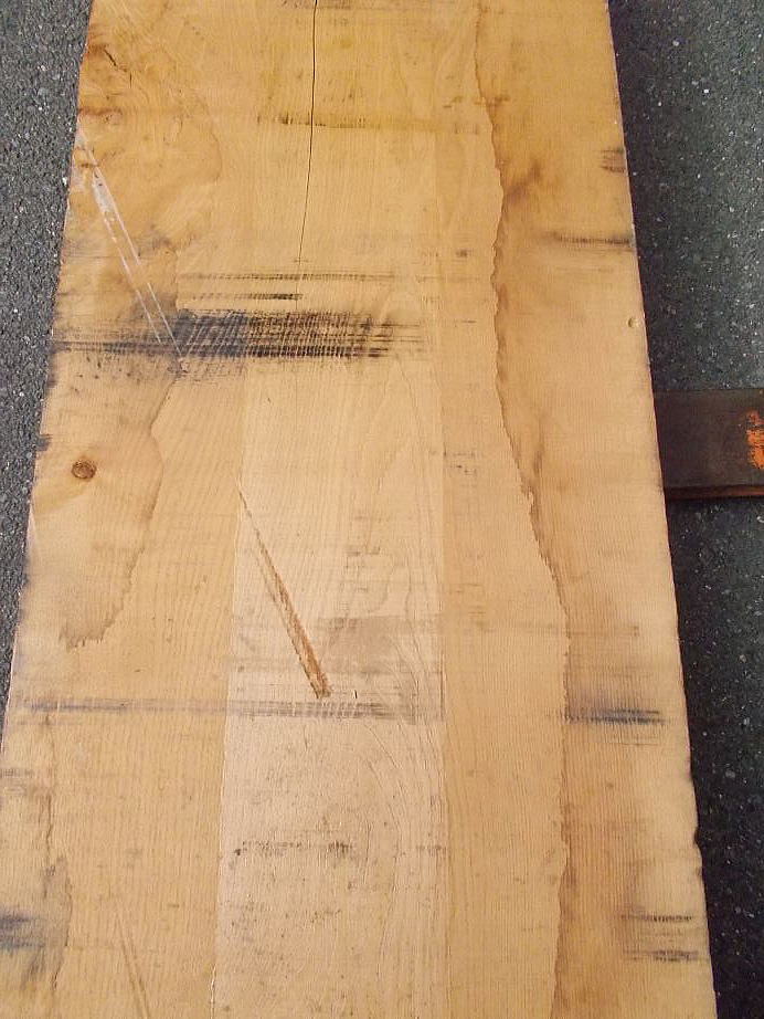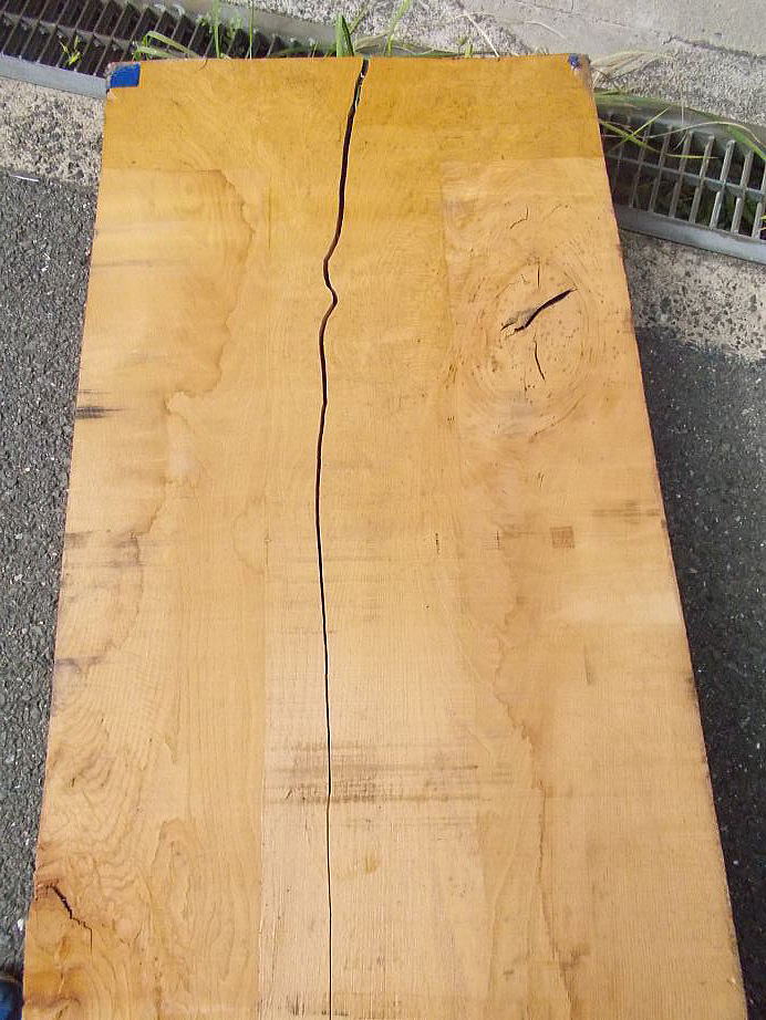 |  おもて面 (L=3980mmの場合 27mm程の縦反り、L=2620mmの場合 9mm程の縦反りがあります。) (ハナ割れ・節・干割れ・センコウ虫穴があります。)     おもて面拡大 (L=3980mmの場合 27mm程の縦反り、L=2620mmの場合 9mm程の縦反りがあります。) (ハナ割れ・節・干割れ・センコウ虫穴があります。) |  裏面 (ハナ割れ・節・干割れ・センコウ虫穴があります。)     裏面拡大 (ハナ割れ・節・干割れ・センコウ虫穴があります。) | ||