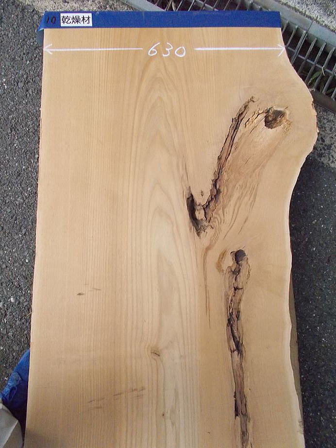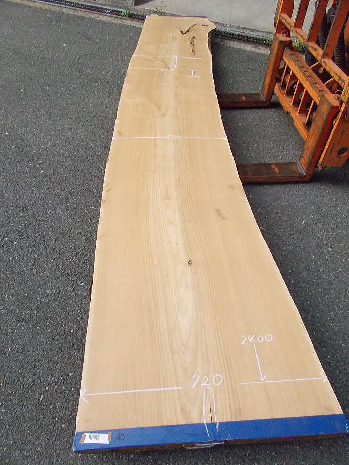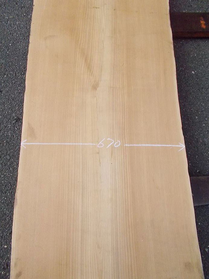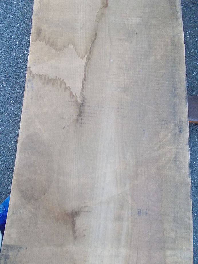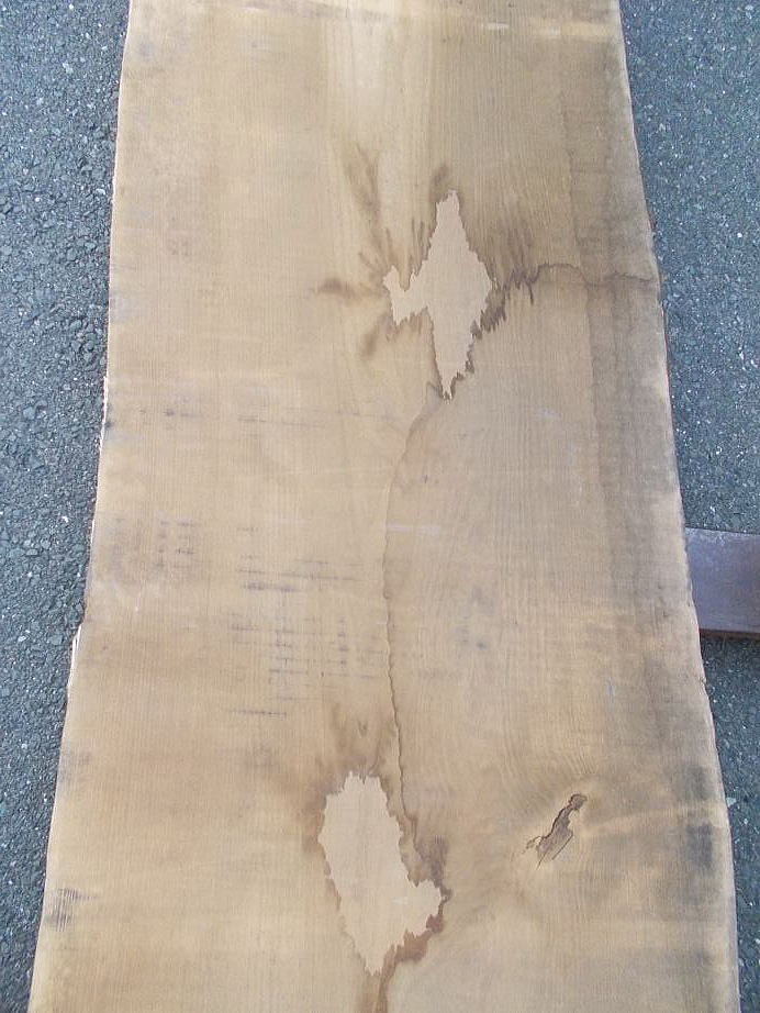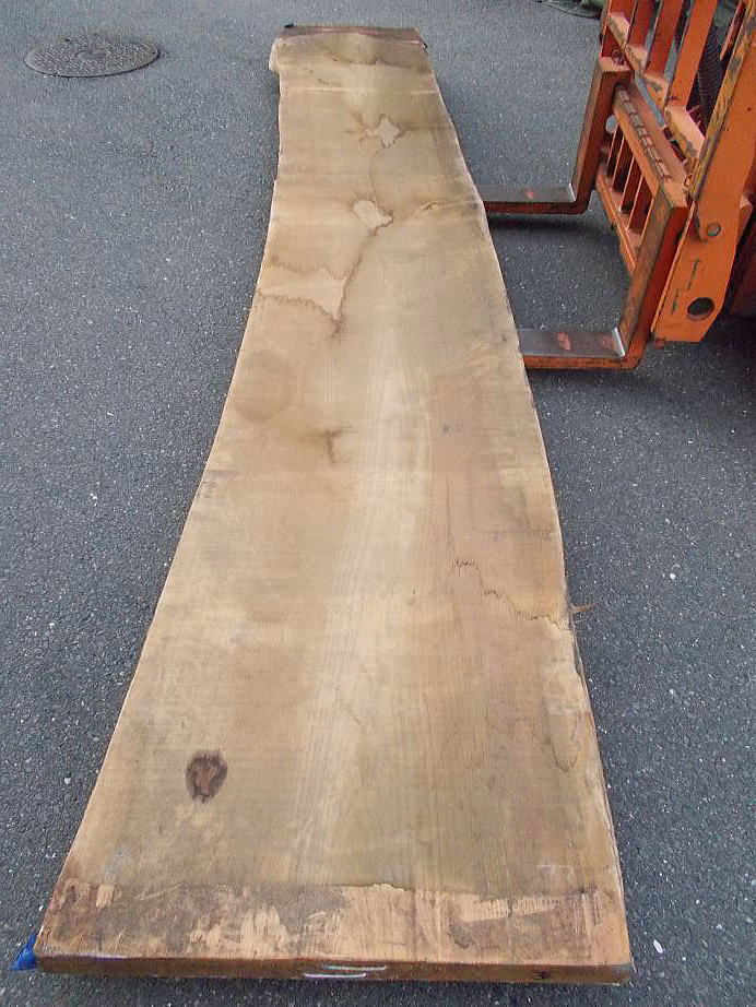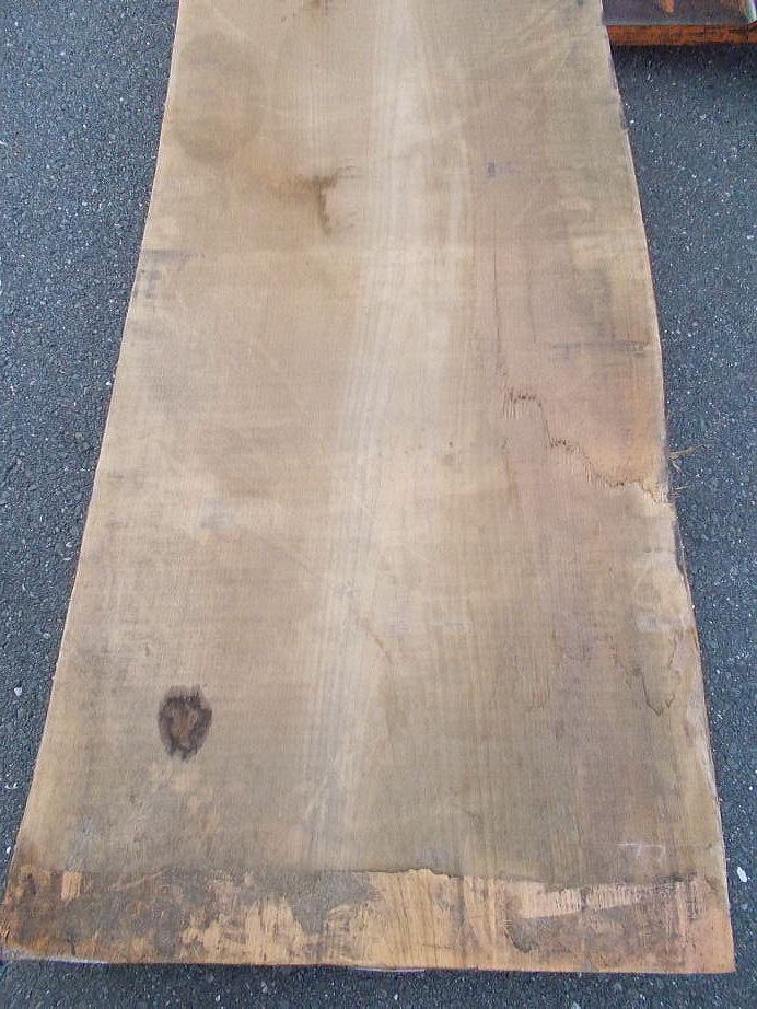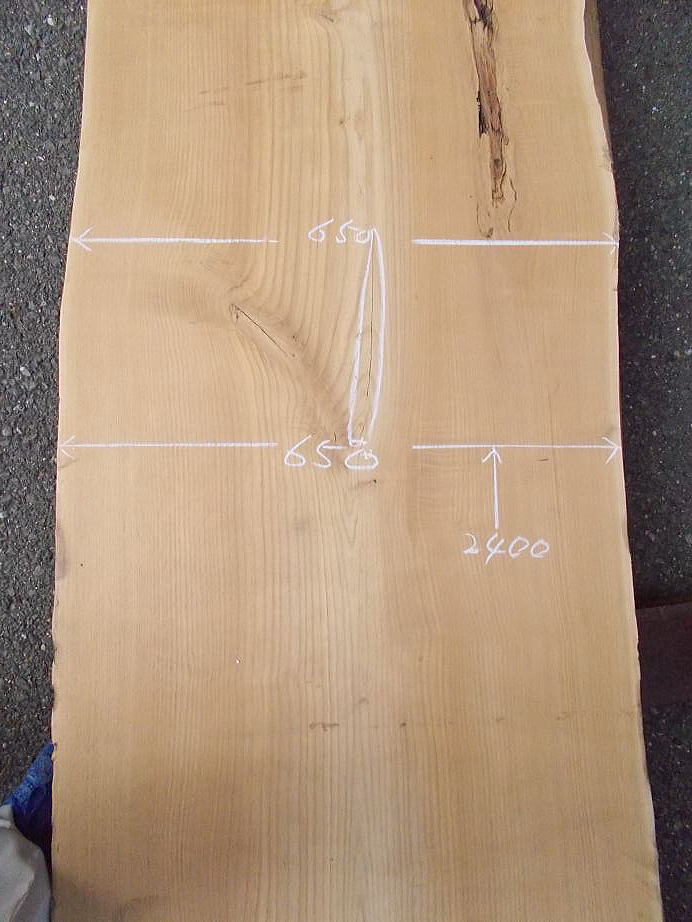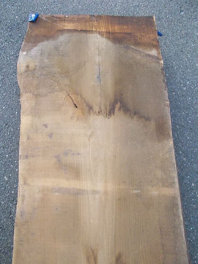 |  おもて面 (L=3980mmの場合 27mm程の縦反り、L=2620mmの場合 9mm程の縦反りがあります。) (ハナ割れ・節・干割れ・センコウ虫穴があります。)     おもて面拡大 (22〜27mm程度の逆反りがあります。割れ・節・腐れ等があります。) |  裏面 (割れ・節・アク・反り等がありますが、こちらの面の方が綺麗です。)     裏面拡大 (割れ・節・アク・反り等がありますが、こちらの面の方が綺麗です。) | ||