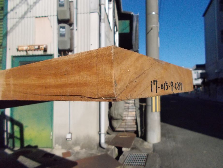 (右木口割れ長さ90mm、1〜2mm程度の反りがあり、少しセンコウ虫穴があります。)