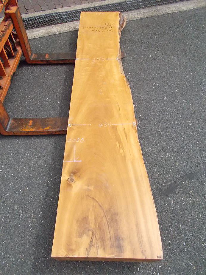 |  おもて面 (面白い縮み杢がありますが、穴埋めや節・色変りも有ります。) (手前の割れを外して長さ2030mmで縦反りが有ります。)  反対面 (面白い縮み杢がありますが、穴埋めや節・色変りも有ります。) |    使用面拡大 (真ん中の写真に面白い縮み杢があります。) |