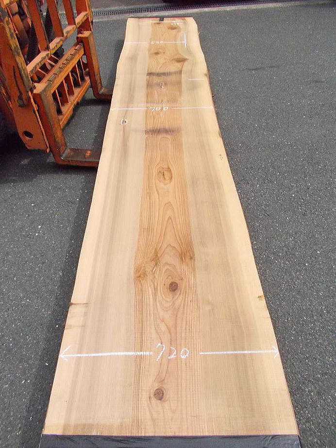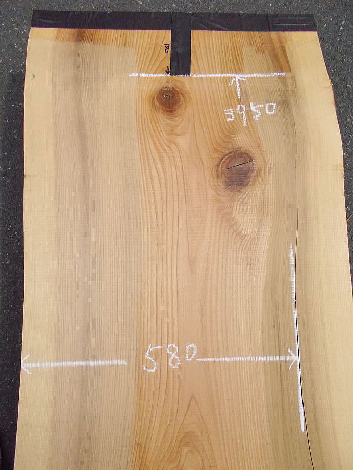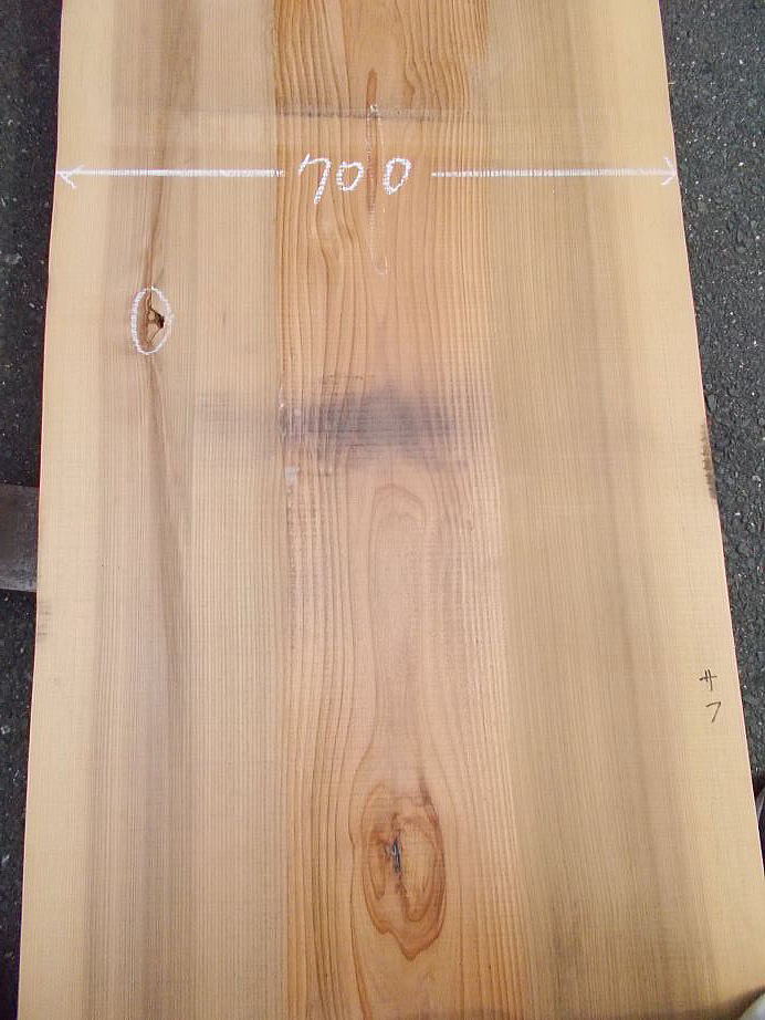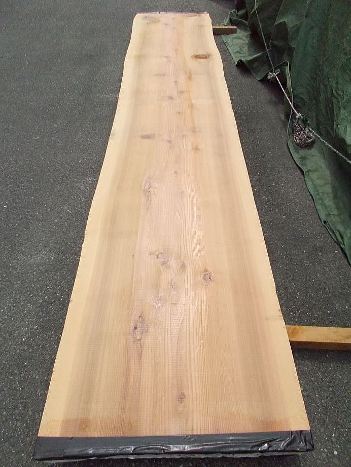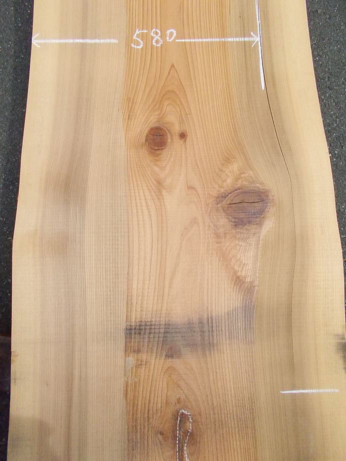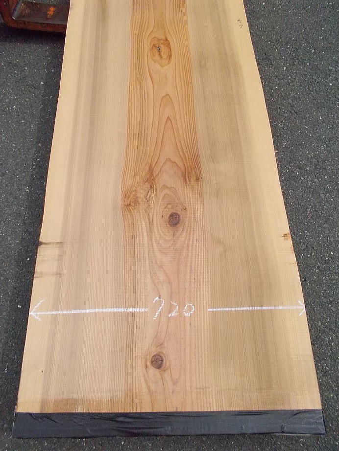 (8mm程度の反りがあり、右側奥に弁割れ、節・干割れ・穴があります。)