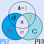 また、円2の中の4つの数字と円3の中の4つの数字を比べると、e,xが共通ですから、d+B=5+Cとなります。