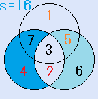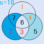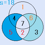 d=4とすると、C=3となり、残りのx=7で、これは、解です。一つの円の中の4つの数字の和S=18です。右図。- d=7とすると、C=6となり、不適です。(6が重複)