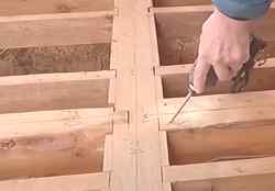 大引きを入れなくても、根太の真ん中に強化材を一本通して固定しておけば、たわみもなくなり床が下がることもない。