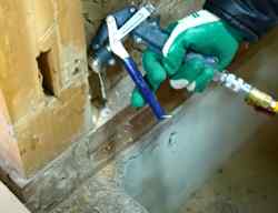 食われてしまった土台は、それ以上被害が拡大しないよう、ドリルで穴をあけ、薬剤を注入する。