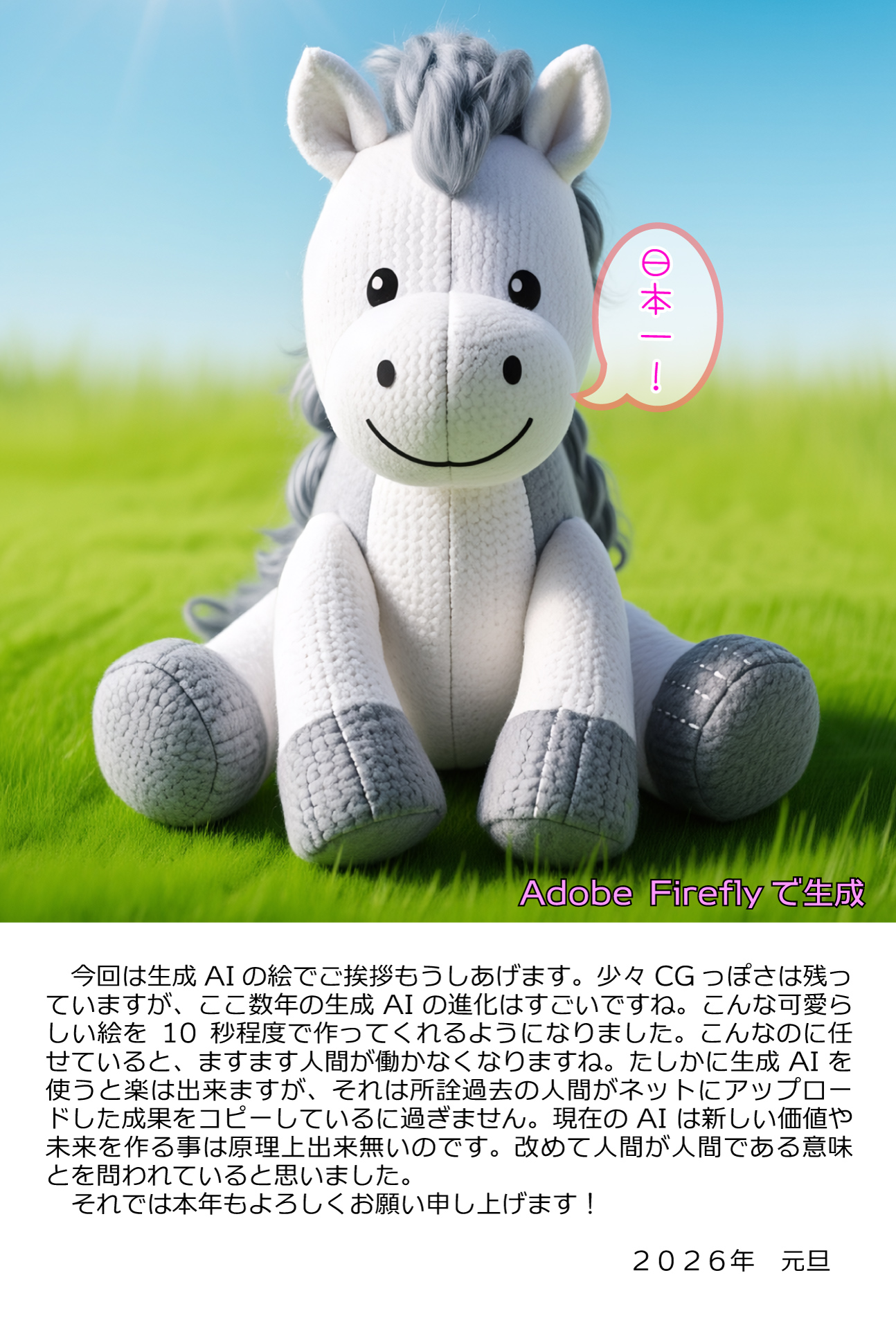 なお、折角高いお金を払っているのだから、Stable DiffusionではなくAdobe Fireflyを使いました。単にケチくさいだけです。しかしAdobe Fireflyは著作権の問題は一切ありません!とか言ってますが、なんかイラスト系の絵ェを出すと中華系のイラストレーターが描いたような絵ェが大量に出てくるんですよね。この学習データは本当に大丈夫なんでしょうかね????