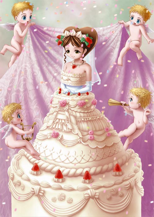 「ミミクリ・ウェディング」 04.1.16 一番の難産でした。何度もメモリ不足で落ちました。 結局生クリーム感があまり出てません……(泣。 明確な背景が無いので、ふわふわした印象になってる点で、ほかのミミクリとは一味違ってます。 左下のプットがお気に入りですw