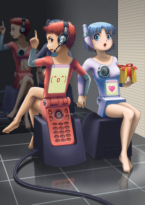 「ミミクリ・フォン」 04.12.1 最初はひとりでした。 裏表両面描きたいと思い、二人になりました。 奥を鏡張りにしたら? とのアドバイスで、合計4人になりました(汗。 青い子の鏡像は隠れてますが、きちんと描いてあります……。