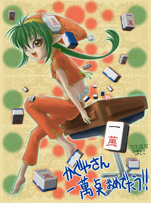 「祝一萬点!!」 03.12.31 kaguyaさんのサイト「らぐらぐ♪」の1万HIT突破を記念して 描かせていただいたお祝いイラストです。 イーマンがこんなにあったらカンし放題ですねw。 麻雀の妖精が全自動雀卓を使うフ抜けた大人たちに 警鐘を鳴らしに来たのでしょう。カンすれ、と。